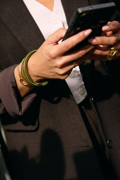 Deze ronde armband in een leuke mosgroene tint met marmer-look is stijlvol en lekker licht. Je draagt hem solo of stackt hem mooi met andere armbanden. Groen en goud? Top-combo als je het ons vraagt!