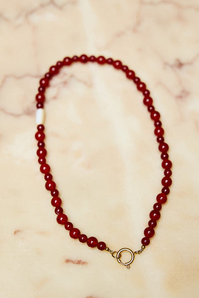 Een mix van rode Cornalijn-parels en een prachtig detail in parelmoer. Deze handgemaakte ketting valt op, maar blijft elegant. Voor de afwerking gebruikten we stainless steel. De gouden kleur blijft dus lang behouden. Deze ketting draag je hoe je het zelf wil: met het slotje vooraan, achteraan of zijdelings en de parelmoer waar je wil.