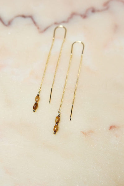 Fijne doorsteekoorbellen met bruin-beige kraaltjes. Fijn en sierlijk voor een gevarieerde look!
