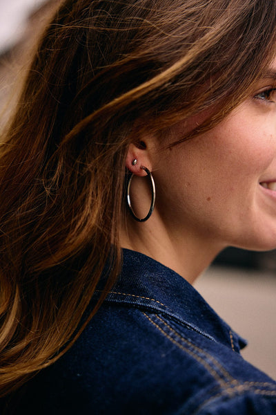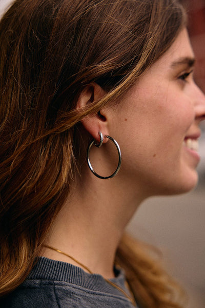 Zilverkleurige hoops van 4 cm met kliksysteem. Strak en comfortabel.